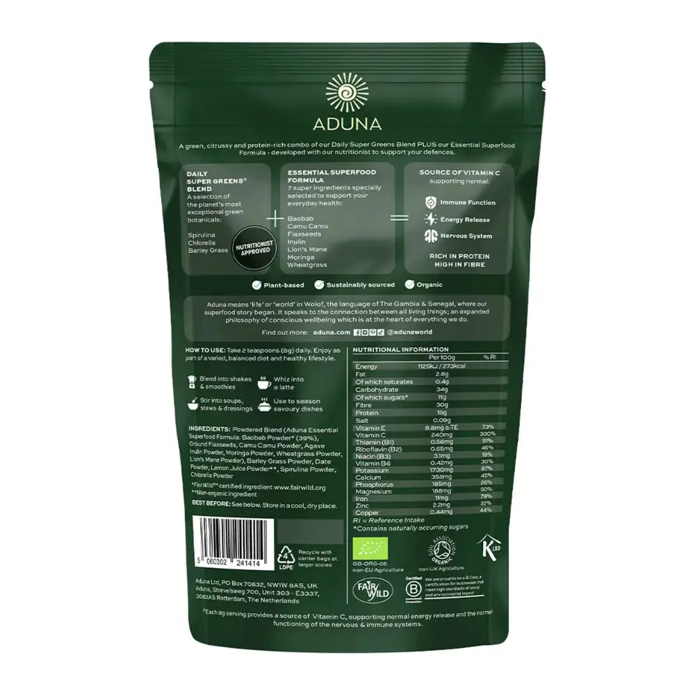 Aduna Advanced Superfood Blend – Super Greens 250g is a premium greens powder combining some of the world’s most nutrient-dense botanicals, including Spirulina, Chlorella, Barley Grass, Wheatgrass, Moringa and FairWild Baobab. Built on Aduna’s Essential Superfood Formula, this advanced blend brings together green plants, fruit extracts and plant proteins to help support everyday wellness function, energy release and nervous system health through its natural vitamin C content.
