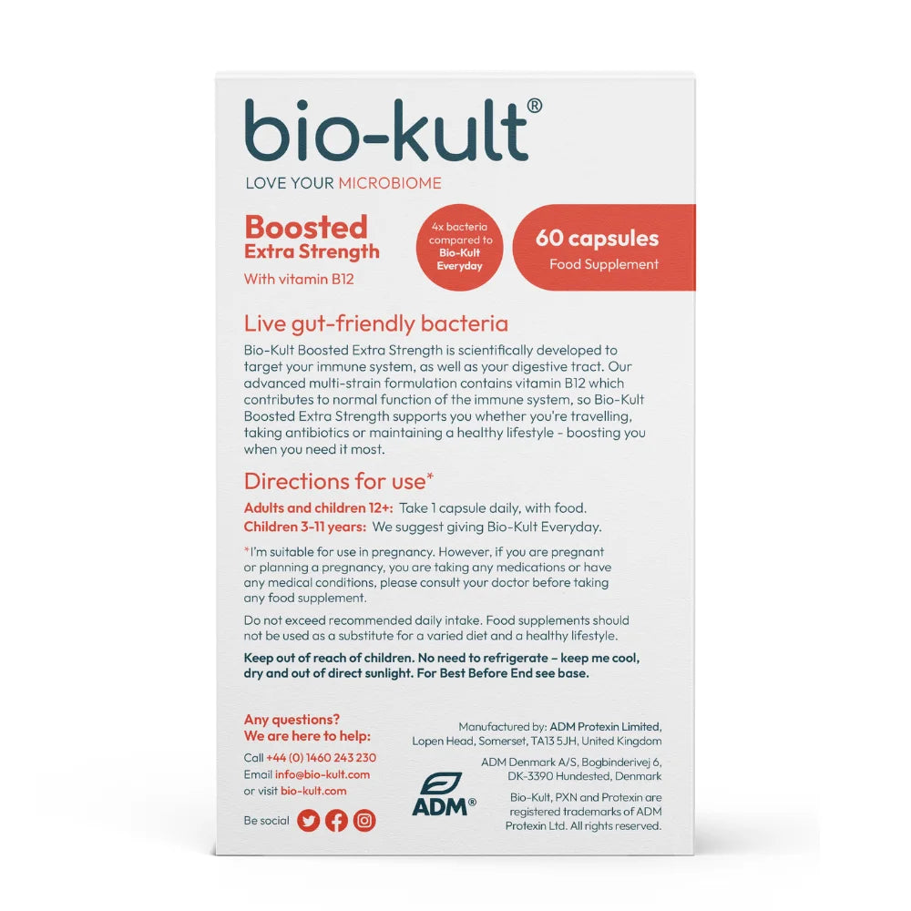 Bio-Kult Boosted 30 Capsules is an extra-strength multi-strain live bacteria supplement with added vitamin B12. Each capsule supplies 8 billion CFU across 14 strains plus B12 to support normal immune function—ideal for busy periods, travel or use alongside antibiotics.
