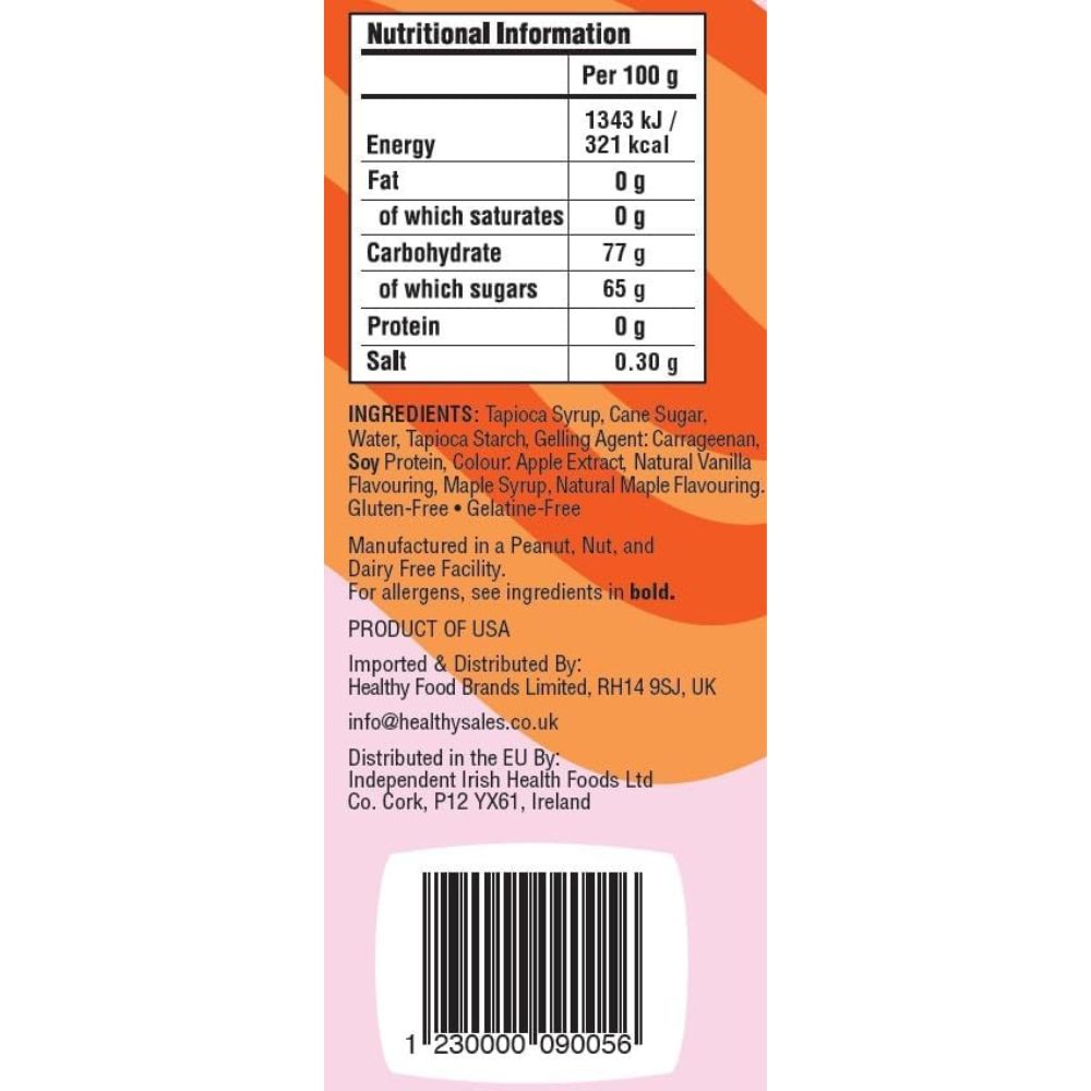 Tapioca Syrup, Cane Sugar, Water, Tapioca Starch, Gelling Agent: Carrageenan, Soy Protein, Colour: Apple Extract, Natural Vanilla Flavouring, Maple Syrup, Natural Maple Flavouring. Allergens Contains: Soy.