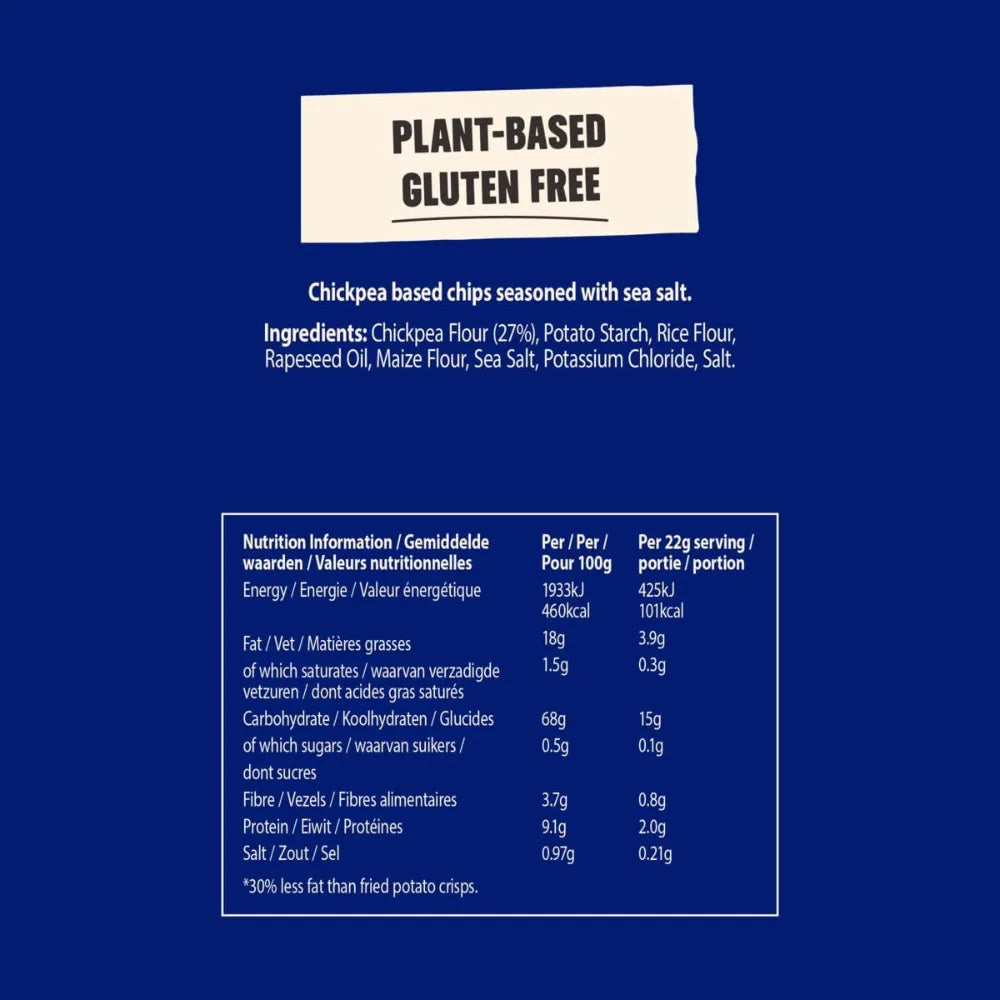 - Chickpea-based gluten free chips with simple sea salt seasoning
