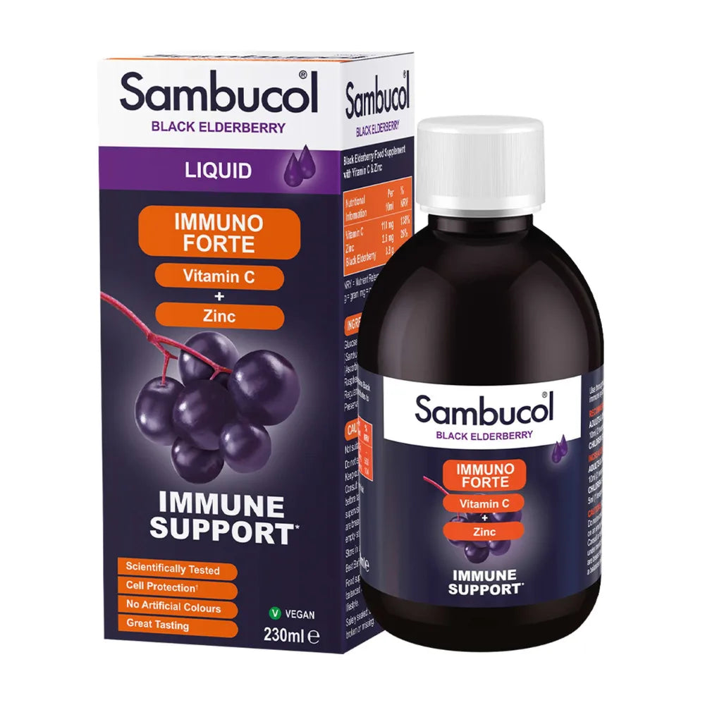Sambucol Immuno Forte Liquid 230ml combines Black Elderberry extract with Vitamin C and Zinc to support everyday wellness for the whole family, all year round. Suitable for ages 3+, vegan and vegetarian, and made with no artificial colours.